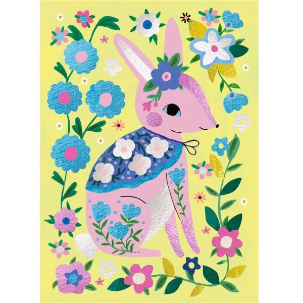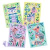 4 adorables animales para decorar con hojas metalizadas. Gracias al código de colores indicado en los cuadros, el niño puede identificar las áreas para metalizar. Utilizando la herramienta, quita la película protectora de la superficie adhesiva para colocar allí la hoja metalizada. El material se coloca como por arte de magia y los cuadros se iluminan.