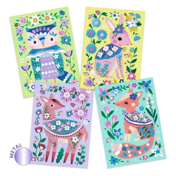 Contenido: 4 tarjetas ilustradas y con adhesivo (15 x 21 cm), 15 hojas de metal para colocar, 1 herramienta de plástico para descubrir las superficies adhesivas, 1 folleto explicativo paso a paso a color.