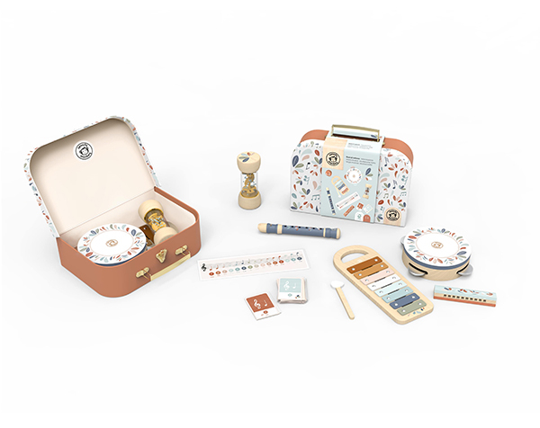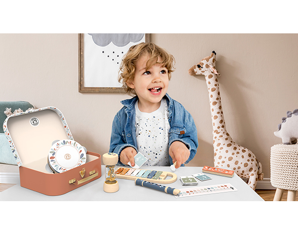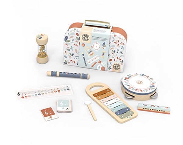 Porque la música estimula todas las áreas del desarrollo infantil, como la creatividad, y los sentidos, esta maleta incluye 5 instrumentos musicales: el xilófono con ocho teclas metálicas de colores; la pandereta, que produce un sonido divertido y suave; el trombón de madera que recrea el suave sonido de la lluvia al caer las cuentas al girar el instrumento; la flauta dulce de colores con pintura no tóxica e insípida, diseñada para principiantes; y la armónica, que sin duda encantará a los más pequeños, ya que no requiere experiencia.